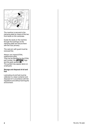 This section contains useful resources for the Stihl TS400 Disc Cutter. 4 TS 410 TS 420 The machine is secured to the clamping plate by means of.